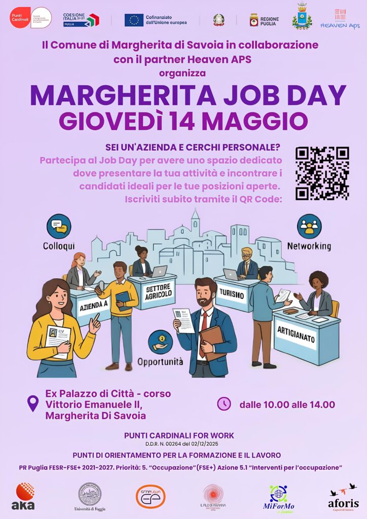Il Comune di Margherita di Savoia, nell'ambito del progetto Punti Cardinali – Saline in Labs, è lieto di invitarvi al Job Day che si terrà il giorno 14 maggio 2026.